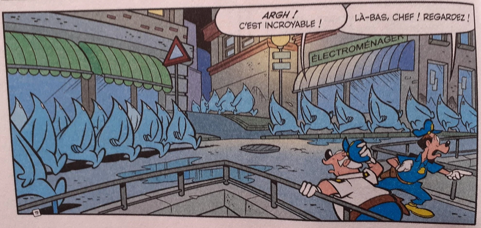 Le lendemain, la banque s'est faite attaquer par les aquabots, et une lance à incendie. Encore une fois, la police a tenté de les arrêter. Aquadombre a donc décidé de mettre sous surveillance Mickey Mouse et son ami Iga Biva, ceux qui lui mettent des bâtons dans les roues. Pour cela, il a envoyé le sosie de Lucette pour les suivre. Les deux détectives ont réussi à remonter jusqu'à Lucette, con ancienne assistante.