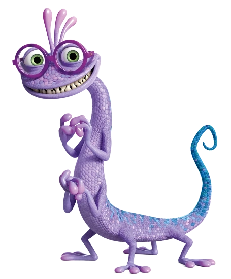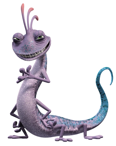 Dans Monstres et Cie, Léon est un monstre reptilien qui a une crête à trois antennes avec des pointes roses sur le dessus de sa tête, des écailles violettes, des yeux verts, quatre bras et jambes, une queue bleu ciel et a la capacité de se fondre complètement. En harmonie avec son environnement, le rendant invisible (en plus de pouvoir s'accrocher aux murs).