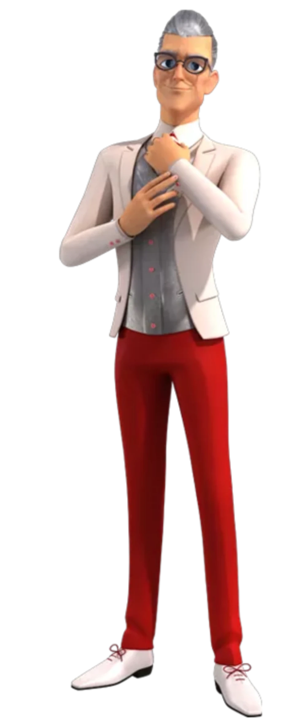 Il porte une veste crème avec un gilet argent, une chemise blanche et une cravate rayée rouge et blanche sous laquelle il cache le Miraculous du Papillon. Il porte aussi un pantalon rouge, des chaussures blanches et une paire de lunettes. Il a une alliance argentée au doigt.